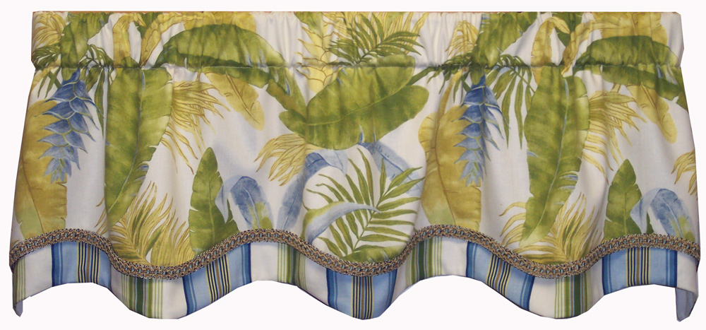 The Grandeur Valance is another of our beautifully made valances that can give you the illusion of being a custom board mounted top treatment with its flat rod pocket. The Grandeur Valance is available in 6 widths: 50", 63", 78", 100", 124" and 150" and is one of our most popular styles. Your choice of scalloped fringe, ball fringe or braid trim applied to the bottom of the top layer. A contrast fabric on the bottom layer of this treatment gives this valance a custom look as well as being a great value.
