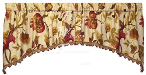 The Tudor Valance is fully lined and is available in three sizes. This window valance comes standard with either ball fringe, braid trim or scalloped fringe applied to the bottom edge. Optional tassel fringe is available as an option to replace the standard trims.